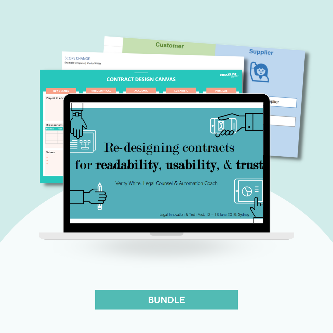 Presentation video recording, slide deck and resources bundle for Re-Designing Contracts For Readability, Usability, and Trust from Verity White at Legal Tech Fest.